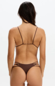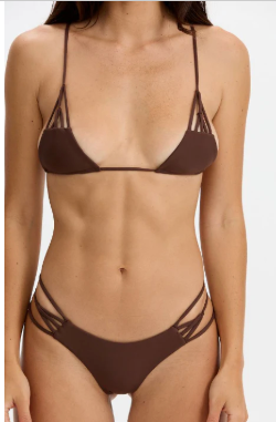 This skimpy triangle top with a strapy, woven, cut-out top detail. This is a triangle top, anchored on one side, which can be adjusted for more or less coverage. A simple, slidable strap in the back allows for minimal tan lines.