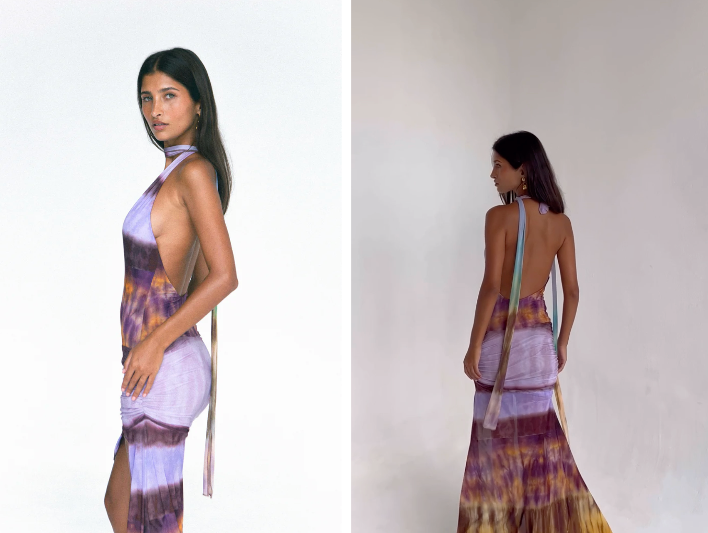 Made from eco-conscious Italian tie-dye mesh, the Hazel maxi dress in Equinox demands attention. Doubled through the bust and waist for a bombshell silhouette and perfectly placed coverage. Hazel isn't just a dress, she's an event.