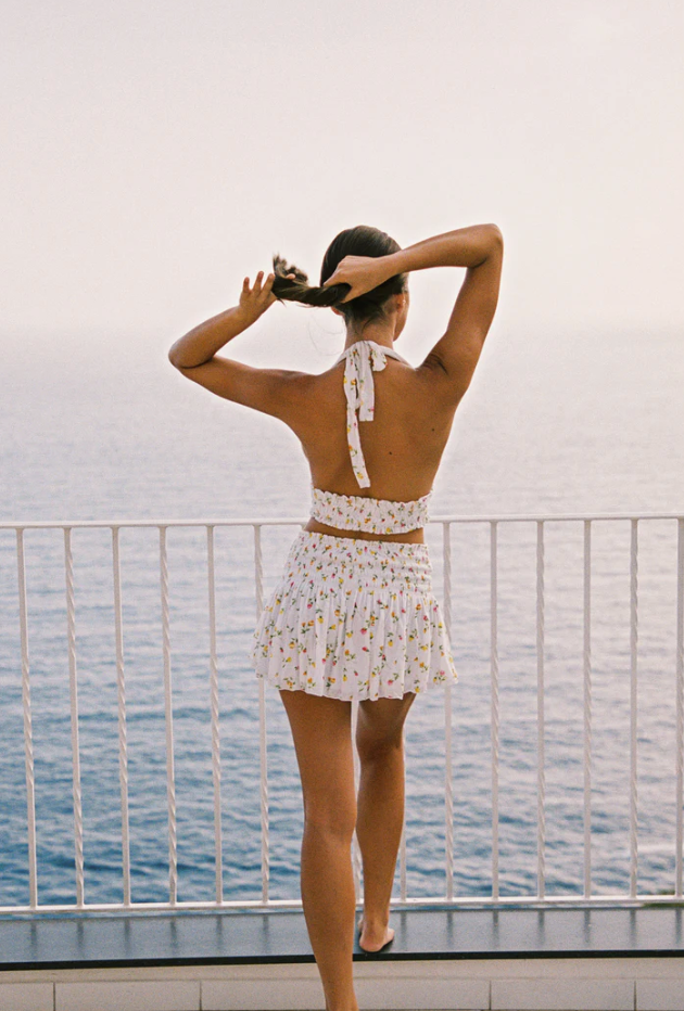 Romeo skirt in Bebe White. Meet Romeo, the mini skirt half of your new favorite resort ensemble. This soft and stretchy mini features an artfully ruched band and sweet, tiny floral print.